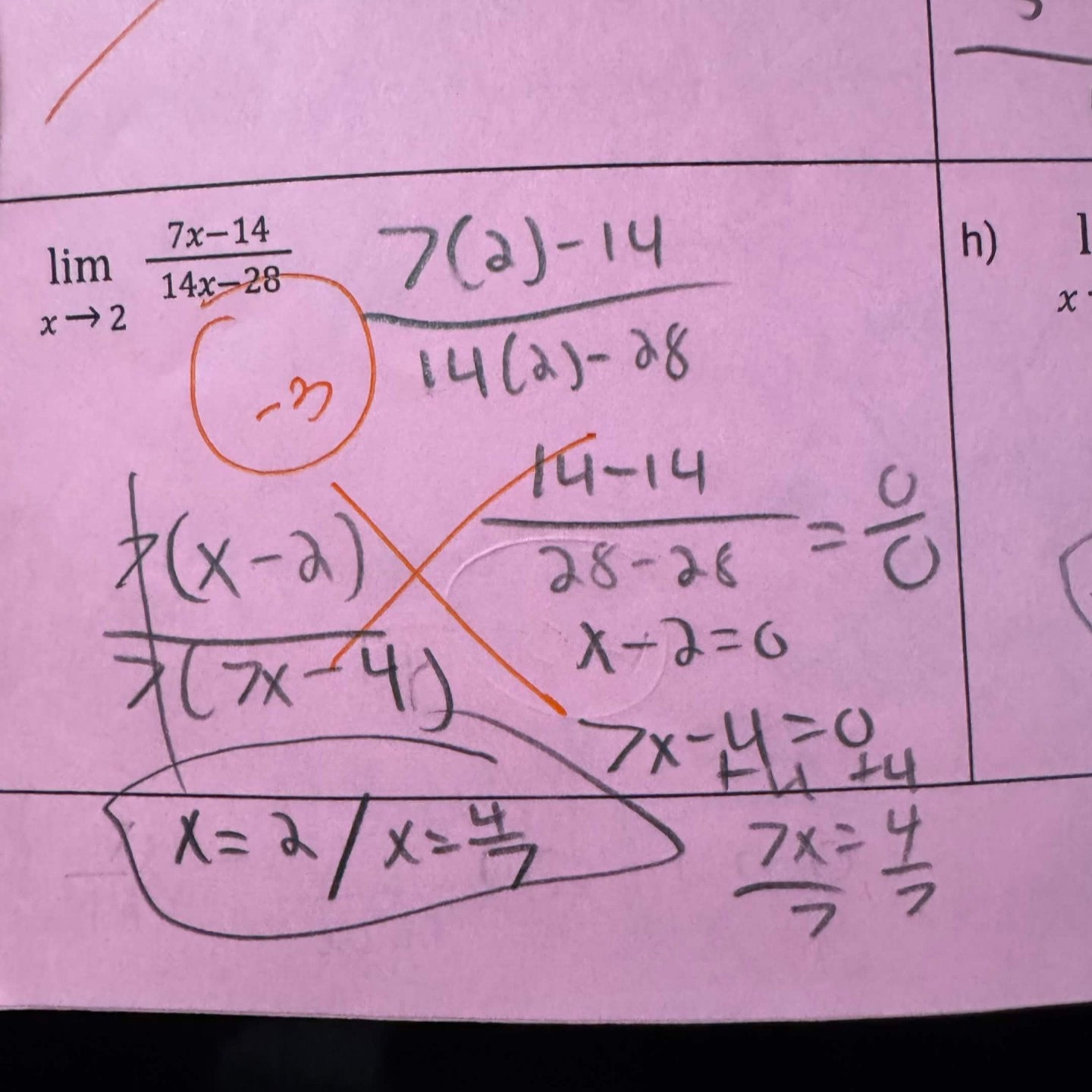The image provided above was one of the questions on the exam that I ended up doing incorrectly. I had the right idea with plugging in the 2 as x and finding out that the end result was a 0/0 so I could then factor to find my answer. However I ended up factoring wrong which lead to me getting the problem wrong. When factoring the denominator I factored out 7 when instead I should have found a better common factor which would have been 14. Through 7 I came out with (7x-4), but if I had factored 14 I would have gotten (x-2) both in the numerator and denominator. This would had allowed me to take out the (x-2) since they would have cancelled each other out and left me with 7/14 which would have been my final answer, 1/2.
